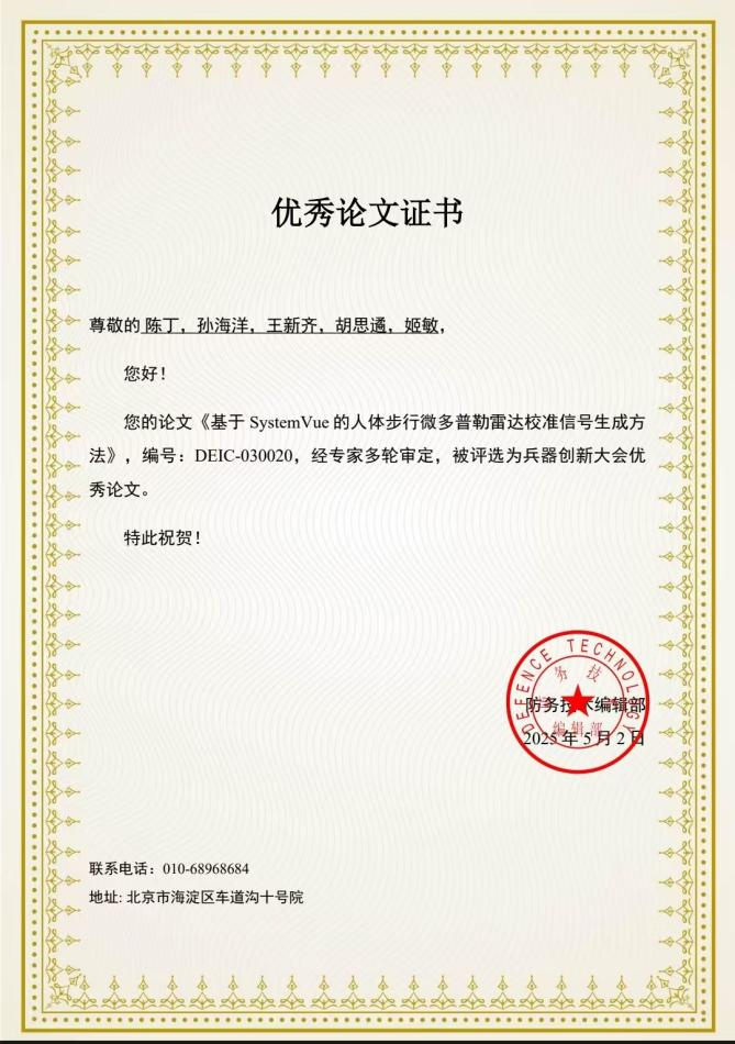 会后,经专家多轮审定,我院23级兵器科学与技术学科硕士研究生孙海洋(第二作者兼通讯作者)撰写的《基于SystemVue的人体步行微多普勒雷达校准信号生成方法》,被评选为兵器创新大会优秀论文。