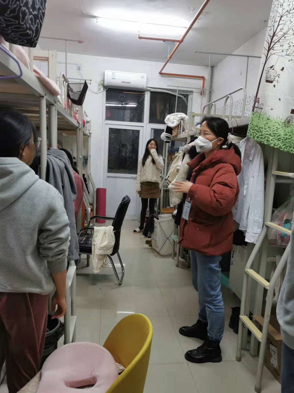 抗疫就是命令,防控就是责任。12月27日,突如其来的防控升级给学生防疫工作带来极大考验,需要入驻学生宿舍及时展开大量工作,身为党员的田润妮老师接回孩子交给家里老人照管,义无反顾的响应学院号召,连夜赶赴校区,代替怀孕的研究生管理秘书入住校园公寓。