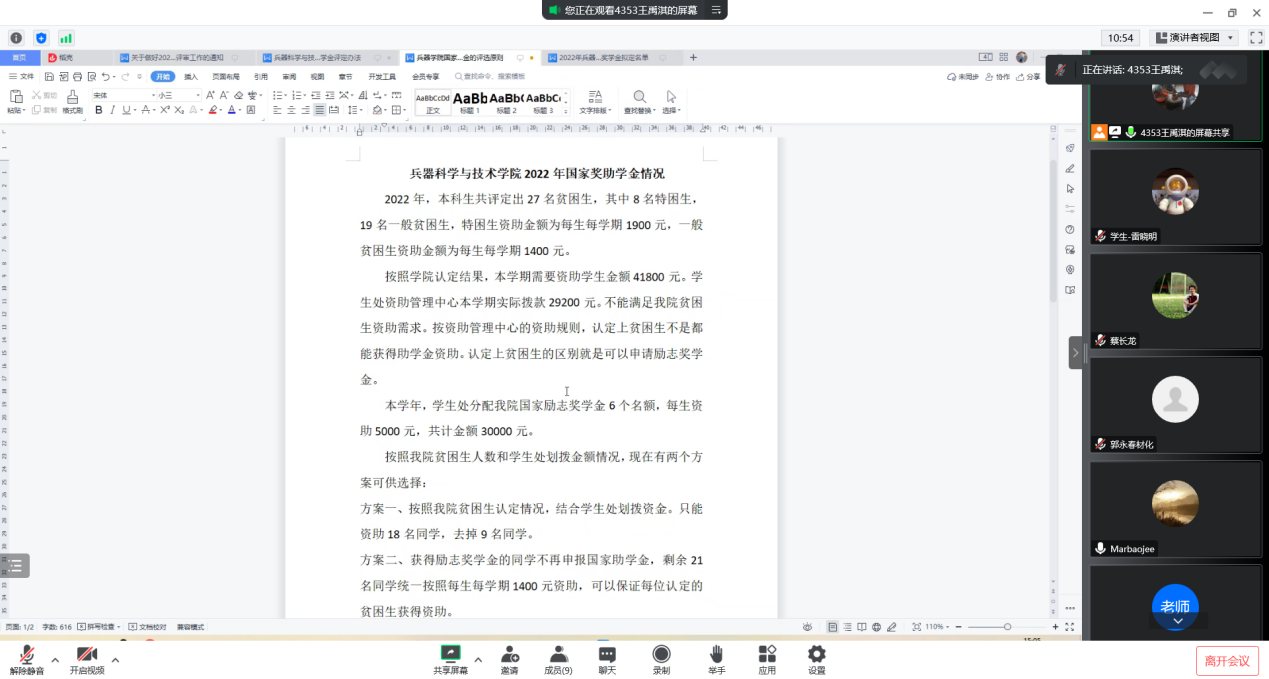 会议第二项,王国栋老师介绍我院本科生国家奖助学金相关情况,并初步确定了评审的两种方案:一是按照学生申请名额及学生处分配名额,由高至低依次评选;二是惠及更多家庭困难学生,同一学生奖助学金不可同时获得。